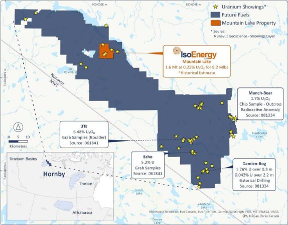 – IsoEnergy Ltd. ("IsoEnergy" oder das "Unternehmen") (TSX: ISO; OTCQX: ISENF) – https://www.commodity-tv.com/ondemand/companies/profil/isoenergy-ltd/freut sich bekannt zu geben, dass es mit Future Fuels Inc. ("Future Fuels") einen Vertrag über den Kauf von Vermögenswerten (der "Vertrag") abgeschlossen hat, gemäß dem das Unternehmen zugestimmt hat, alle Rechte, Titel und Anteile am Grundstück Mountain Lake in Nunavut (das "Grundstück" oder "Mountain Lake") an Future Fuels zu verkaufen (die "Transaktion"). Future Fuels (TSXV: FTUR) ist ein börsennotiertes Unternehmen, das einen bedeutenden Landbesitz im Hornby Basin, das den Mountain Lake umgibt, konsolidiert hat (Abbildung 1).