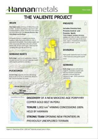 Das Valiente-Projekt von Hannan Metals identifizierte einen Porphyr-Kupfer-Gold-Gürtel aus dem Miozän in Perus Back-Arc mit 18 Cu-Au-Porphyr- und Epithermalsystemen auf einer Fläche von 140 km x 50 km. Das Belen-Prospekt (Abbildung 1), 19 km östlich von Tingo Maria, umfasst drei Hauptziele: Ricardo Herrera, Vista Alegre und Sortilegio. Obwohl Belen nur 4 % des Besitzes von Hannan ausmacht, weist es aufgrund umfangreicher Anomalien ein beträchtliches Potenzial auf.