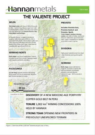 Das Valiente-Projekt von Hannan Metals identifizierte einen Porphyr-Kupfer-Gold-Gürtel aus dem Miozän im Back-Arc von Peru mit 18 Cu-Au-Porphyr- und Epithermalsystemen auf einer Fläche von 140 km x 50 km. Das Belen-Prospekt (Abbildung 1), 19 km östlich von Tingo Maria, umfasst drei Hauptziele: Ricardo Herrera, Vista Alegre und Sortilegio. Obwohl Belen nur 4 % des Besitzes von Hannan ausmacht, weist es aufgrund umfangreicher Anomalien ein beträchtliches Potenzial auf.
