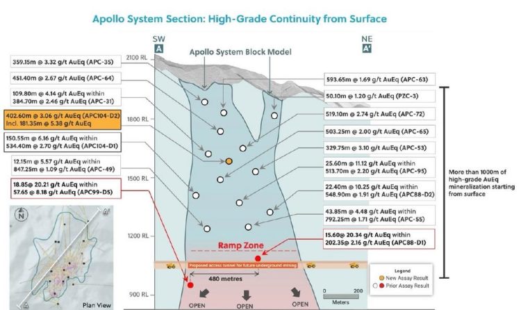 - Die Bohrung APC104-D2 wurde orthogonal zu Apollo niedergebracht und erweiterte erfolgreich die hochgradigen Unterzonen um bis zu 50 Meter in seitlicher Richtung, die ursprünglich von Bohrung APC104-D1 durchteuft wurden. Zur Erinnerung: Die Entdeckungsbohrung APC104-D1 wurde am 16. Dezember 2024 gemeldet und durchteufte 150,55 Meter mit 6,16 g/t AuÄq innerhalb von 534,40 Metern mit 2,70 g/t AuÄq.
