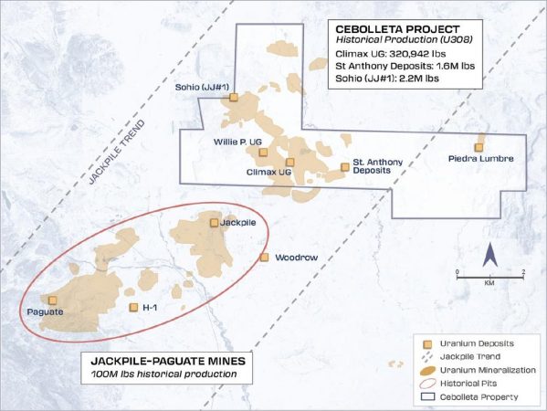 Das Projekt ist seit seiner Übernahme im Jahr 2024 ein Eckpfeiler im Portfolio von PUR. Die Uranmineralisierung auf dem Projekt ist die nördliche Erweiterung des Jackpile-Paguate-Trends der Uranvorkommen, der eines der größten Sandstein-Uranvorkommen der Welt ist.[1] ,[2] Insgesamt produzierten die Minen des Laguna-Bergbaubezirks im Zeitraum von 1951 bis 1983 mehr als 100 Millionen Pfund U3O8 aus dem Jackpile-Paguate-Trend, wie von Geologen des New Mexico Bureau of Geology und Mineral Resources und dem US Department of Energy dokumentiert wurde.2 Die nördliche Fortsetzung des Jackpile-Paguate-Trends der Uranvorkommen im südlichen Teil des Projektgrundstücks ist gut bekannt, aber das Ausmaß der Mineralisierung ist nicht vollständig definiert, was mehrere wichtige potenzielle Explorations- und Wachstumsmöglichkeiten für das Unternehmen darstellt.