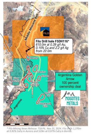 Mogotes Metals Inc. ist ein Mineralexplorationsunternehmen, das im aussichtsreichen Bezirk Vicuña in Argentinien und Chile nach Kupfer und Gold sucht. Das Vorzeigeprojekt von Mogotes, Filo Sur, grenzt an die Kupfer-Gold-Silber-Entdeckung Filo del Sol und liegt entlang eines N-S verlaufenden Gürtels mit den Kupfer-Gold-Lagerstätten Filo Del Sol – Aurora und NGEx Minerals Lunahuasi und Los Helados.