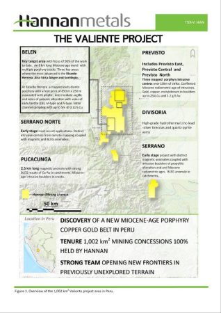 Das Grundstück Belen macht etwa 4 % des gesamten Landbesitzes von Hannan in Valiente aus, wo das Unternehmen 18 Kupfer-Gold-Porphyr- und Epithermalsysteme in einem 140 km x 50 km großen Gebiet in der peruanischen Backarc-Region identifiziert hat.