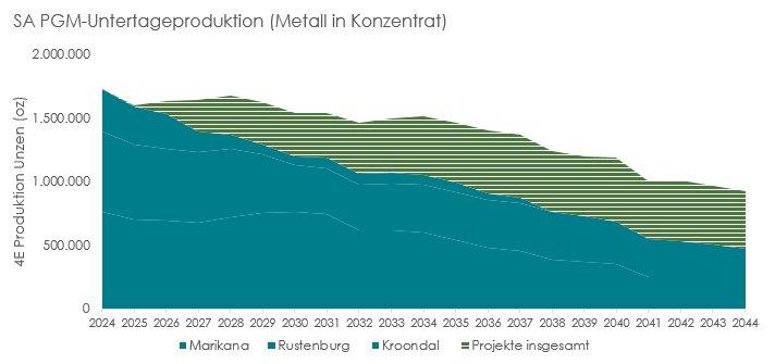 - Das obige Diagramm spiegelt das potenzielle Proforma-Produktionsprofil für die PGM-Betriebe in SA wider, das auf den vom Board genehmigten Erzreserven für die Lebensdauer der Mine (LOM) zum 31. Dezember 2023 basiert und zur Veranschaulichung durch potenzielle Erschließungs- und Erweiterungsprojekte überlagert wird, die derzeit Gegenstand von Machbarkeitsstudien sind. Das aktuelle LOM-Produktionsprofil (blau) basiert auf den gemeldeten Mineralreserven zum 31. Dezember 2023 auf einer 100 %-Basis, wobei die Wiederaufbereitung der bestehenden Abraumhalden ausgeschlossen ist. Die dargestellten Projekte umfassen die Tiefenerweiterung von Kroondal, die Projekte E4, E3 und Saffy Deep Brownfields. Die 4E PGM-Metallpreisannahmen, die das Proforma-Produktionsprofil stützen, beinhalten Platin US$ 923/oz, Palladium US$ 1.055/oz, Rhodium US$ 4.350/oz und Gold US$ 1.925/oz. Die Ergänzung zu den Mineralreserven und Mineralressourcen, die weitere Einzelheiten enthält, ist unter https://www.sibanyestillwater.com/news-investors/reports/annual/2023/ verfügbar.