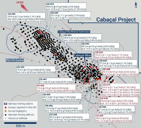 Meridian Mining UK. S (TSX: MNO), (Frankfurt/Tradegate: 2MM) (OTCQX: MRRDF) ("Meridian" oder das "Unternehmen") – https://www.commodity-tv.com/ondemand/companies/profil/meridian-mining-uk-societas/ – freut sich, ein Update der Bohrergebnisse des fortgeschrittenen Cu-Au-Ag-VMS-Projekts Cabaçal ("Cabaçal") bekannt zu geben. Diese Ergebnisse ("Tabelle 1") werden durch CD-639s 20,9m @ 6,5g/t AuEq (4,4% CuEq) aus 95,3m hervorgehoben, einschließlich 7,1m @ 9,2g/t AuEq (6,2% CuEq) aus 104,0m ("Abbildung 1"). Die Ergebnisse bestätigen die Erweiterungen und Projektionen der mehrfach gestapelten Schichten der VMS-Mineralisierung von Cabaçal, die robuste hochgradige Au-Cu-Ag-Gehalte enthalten. Die Bohrungen werden fortgesetzt; weitere Ergebnisse stehen noch aus.