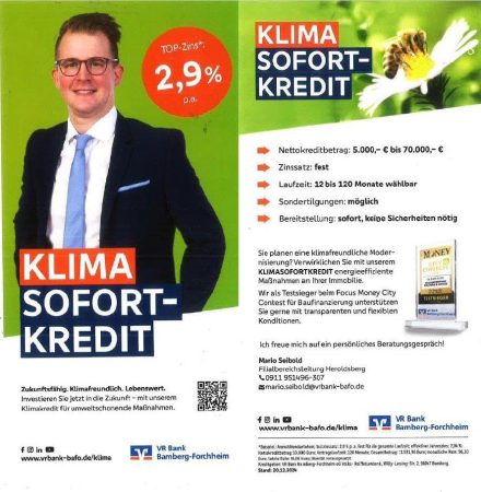 Die VR Bank Bamberg-Forchheim und iKratos Solar- und Energietechnik GmbH, beide von Focus Money ausgezeichnet, bieten ihren Kunden erstklassige Konditionen, um den Zugang zu nachhaltigen Energielösungen zu erleichtern. Mit dem neuen Klima-Sofortkredit der VR Bank Bamberg-Forchheim können iKratos-Kunden ihre Photovoltaikanlagen, Stromspeicher, Wärmepumpen und weitere energieeffiziente Maßnahmen jetzt unkompliziert und zu attraktiven Konditionen finanzieren.
