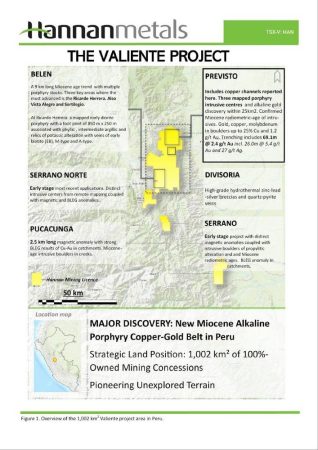 Im Jahr 2021 hat Hannan 1.002 km2 an Bergbaukonzessionen, die sich zu 100 % in seinem Besitz befinden, abgesteckt und hält diese weiterhin. Sie erstrecken sich über nicht erkundetes Gelände im zentralen Osten Perus, das potenzielle mineralisierte Porphyrziele beherbergt. Das Projekt Valiente hat sich schnell von einem Greenfield-Projekt zu einer Gelegenheit mit mehreren Prospektionsgebieten entwickelt.