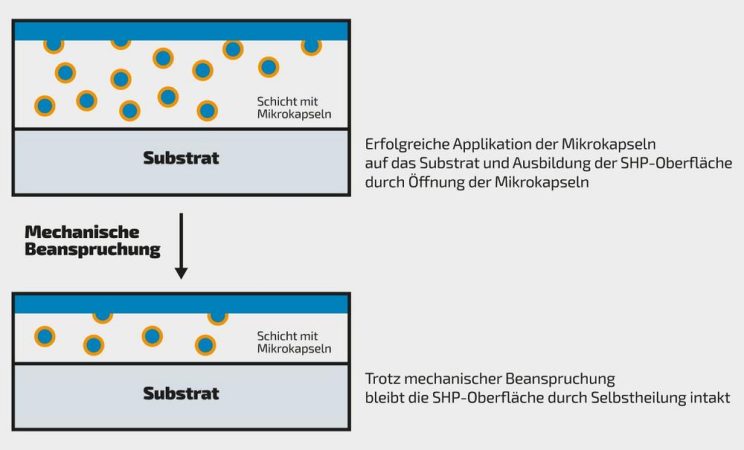 Durch Integration von Mikrokapseln in Kunststoffcompounds können diverse Eigenschaftsverbesserungen in Bauteilen erzielt werden. Am Kunststoff-Zentrum SKZ gibt es bereits aus anderen Forschungsvorhaben umfangreiche Erfahrungen mit der Entwicklung und dem Einbringen von Mikrokapseln in Kunststoffsysteme. Bei einem Erfolg des im September 2024 gestarteten und bis 2027 geplanten Forschungsprojektes sind zusätzliche Anwendung für selbstregenerierenden SHP-Oberflächen denkbar. Überall dort, wo tribologisch belastete Beschichtungen im Außenbereich zum Einsatz kommen, kann die Entwicklung Vorteile bringen.
