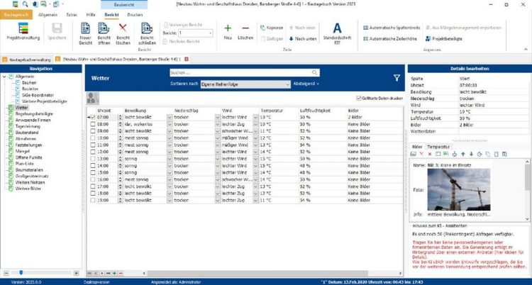 Bautagebuch 2025 unterstützt Planer, Bauleiter und Projektmanager bei der Vor-Ort-Erstellung von Bautagebüchern und Bautagesberichten durch strukturierte Abfragen und Vorlagen, spezielle Funktionen und automatisierte Abläufe sowie durch die parallele Erfassung und Zuordnung von Informationen. Auf der Baustelle immer wiederkehrende Aktivitäten werden so rationell dokumentiert und mobil erfasste Baustellendaten müssen nicht mehr im Büro nachträglich Gewerken und Vorgängen zugeordnet werden. Dokumentiert werden alle Leistungen, Lieferungen und Tätigkeiten sowie die jeweiligen Arbeitsbedingungen auf der Baustelle. Erfasst werden zum Beispiel anwesende Firmen, ausgeführte Arbeiten, Materialeingänge, Mängel, Behinderungen, Nachträge und Änderungen, Baubesprechungs-Ergebnisse, Prüfungen und Messungen, besondere Vorkommnisse, Witterungsverhältnisse und anderes mehr. Für eine einfache Dokumentation des aktuellen Baustellenfortschritts und etwaiger Mängel können dem Baubericht Fotos hinzugefügt und verwaltet werden. Mit den neuen KI-Assistenten lassen sich Bauabläufe oder Mängel zudem noch komfortabler dokumentieren.