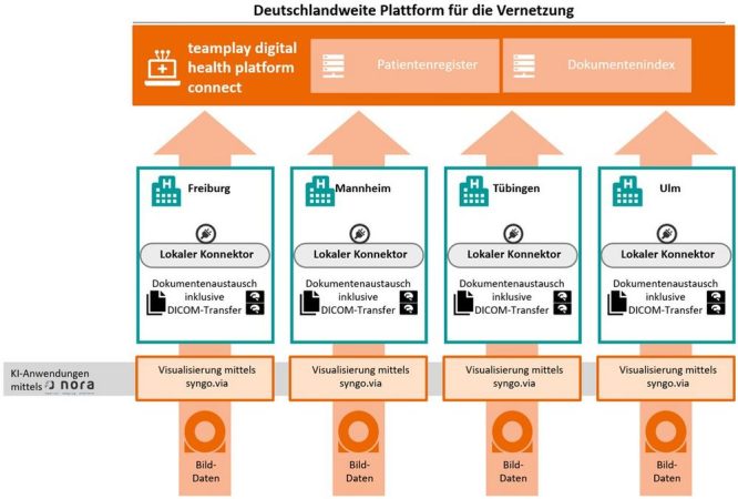 Herzstück des Projekts ist die Dateninfrastruktur „teamplay digital health platform connect“ (Abb. 1), die erstmals den sicheren Austausch hochkomplexer Gesundheitsdaten über Klinikgrenzen hinweg ermöglicht. Aufbauend auf dem erfolgreichen Vorprojekt PC3, bei dem Photon-Counting-Computertomographen an verschiedenen Universitätsstandorten in Baden-Württemberg installiert wurden, wird mit PC3-AIDA eine vernetzte Versorgung möglich, bei der Ärztinnen und Ärzte an allen beteiligten Standorten Zugriff auf relevante Bild- und Patientendaten erhalten. Dies selbstverständlich unter hohem Datenschutz und auf Basis individueller Patienteneinwilligungen. Neben Bilddaten können auch weitere medizinische Informationen wie Laborwerte ergänzt werden, um so die Aussagekraft der Daten zu erhöhen.