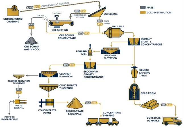 o Die Erprobung einer Teilprobe des Feingutmaterials, bestehend aus 8 Tonnen der Größenfraktion 6-10 mm, die durch die jüngsten Fortschritte in der KI-Software ermöglicht wurde, zeigte vielversprechende Ergebnisse, einschließlich einer Goldgewinnung von 92 % bei einem Mass Pull von 41 % (siehe Tabelle 1). Diese Größenfraktion wurde bisher nicht für die Erzsortierung getestet und könnte eine wesentliche Möglichkeit für die zukünftige Optimierung des Flowsheets darstellen.