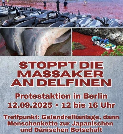 Am World Dolphin Day (Freitag, 12. September 2025) organisiert die Gesellschaft zur Rettung der Delphine e.V. (GRD) eine Protestveranstaltung im Berliner Botschaftsviertel. Mit einer menschlichen Protestkette zwischen der japanischen Botschaft und der Botschaft der nordischen Länder fordern Tierschützer:innen ein Ende der grausamen Delfinschlachtungen in Japan und auf den Färöer-Inseln.