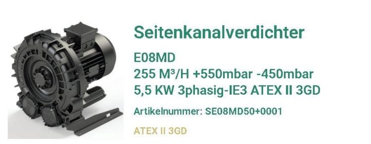 Der Seitenkanalverdichter E08MD ist die optimale Lösung für die sichere, kontinuierliche Förderung von Biogas und anderen brennbaren Gasen in explosionsgefährdeten Bereichen. Durch seine ATEX-Zertifizierung, seine hohe Druckleistung und seine wartungsfreie Bauweise ist er ein zuverlässiges Herzstück jeder Biogasanlage.