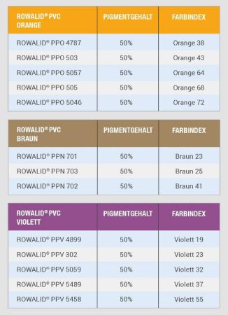 Bei den ROWALID® PVC Präparationen handelt es sich um hochkonzentrierte Einzelfarbstoffpräparationen, die in einem PVC-Trägersystem eingebunden werden. Zur Herstellung von ROWALID® Präparationen kommt ein spezieller Produktionsprozess zum Einsatz, durch den ein maximaler Dispergiergrad der Pigmente angestrebt wird, wie er mit konventionellen Methoden nicht erreichbar ist. Die Lieferform „Mikropulver“ in einer definierten Korngrößenbandbreite ermöglicht neben einem großen Verträglichkeitsspektrum auch hohe Farbstärke und Transparenz.