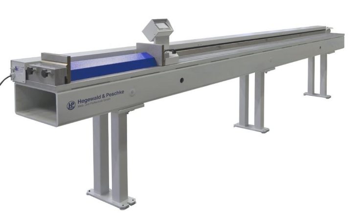 Grundlage der Längenmessvorrichtung bildet ein feinbearbeiteter Stahlträger mit stabilem Untergestell und integriertem Längsführungssystem. Die Prüflinge werden auf einer rund 25 cm breiten Auflage positioniert, die in ergonomischer Arbeitshöhe von 90 cm liegt. Zusätzlich lassen sich die Auflageflächen individuell an kunden- und werkstückspezifische Anforderungen anpassen.