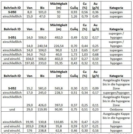 Über dem Grenzwert liegende Probenanalysen (Cu>10.000 ppm) sind enthalten in S050 von 38–47 m, in S051 von 35–38 m, 42,6–53 m, 56–62 m, 68–74 m sowie in S051 von 68–70,25 m.