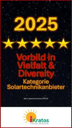 Die iKratos GmbH, ein führender Anbieter von Solartechnik, ist vom FAZ-Institut und Service Value in der Kategorie "Solartechnikanbieter" als "Vorbild in Vielfalt und Diversity 2025" ausgezeichnet worden. Die Auszeichnung würdigt Unternehmen, die sich durch eine vorbildliche Unternehmenskultur auszeichnen und aktiv Vielfalt sowie Inklusion fördern.
