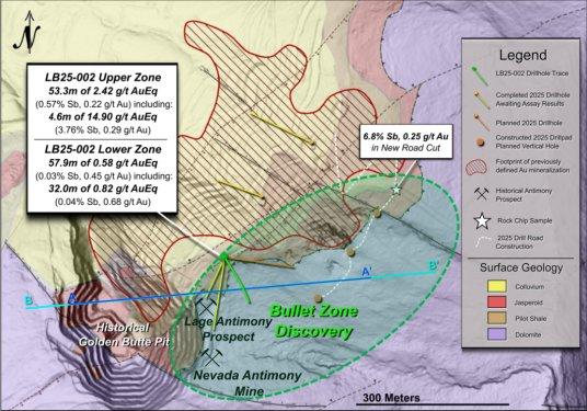 o    LB25-002 Obere Zone (ab Oberfläche): 14,90 g/t AuÄq* über 4,6 Meter (3,76 % Sb und 0,29 g/t Au), in 2,42 g/t AuÄq* über 53,3 Meter (0,57 % Sb und 0,22 g/t Au)