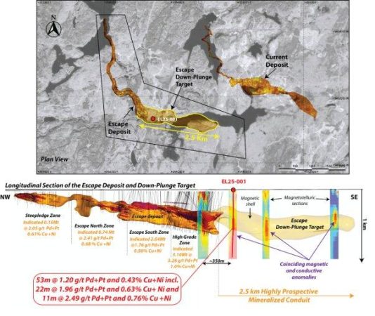 Aufbauend auf dem Erfolg von Bohrloch EL25-001 plant das Unternehmen eine magnetotellurische (MT)-Infill-Untersuchung, um die Größe und Position der leitfähigen Zonen, die möglicherweise mit lokalen Anhäufungen PGE-reicher Sulfidmineralisierung innerhalb der „Ballroom“-Strukturen in Zusammenhang stehen, besser zu definieren. Die Ergebnisse dieser Untersuchung werden als Grundlage für eine Reihe von Folgebohrungen und EM-Bohrlochuntersuchungen innerhalb des 2,5 Kilometer langen Erweiterungsziels dienen.