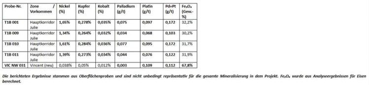 –          Hochgradiger Nickel bestätigt: Oberflächenproben aus der historischen Zone Julie ergaben hochgradige Nickelwerte, einschließlich 1,65 % Ni (Probe: T1B 001).
