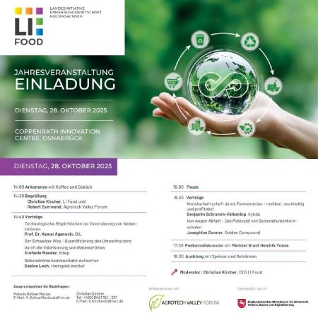 Das Unternehmen Golden Compound GmbH wird auf der diesjährigen Jahresveranstaltung der Landesinitiative Ernährungswirtschaft Niedersachsen (LI Food) am 28. Oktober 2025 im Coppenrath Innovation Centre in Osnabrück einen Vortrag zur nachhaltigen Nutzung von Agrar-Nebenprodukten halten. Die Veranstaltung steht in diesem Jahr unter dem Leitthema „Kreislaufwirtschaft – innovative Ansätze zur Nutzung von Nebenströmen“.