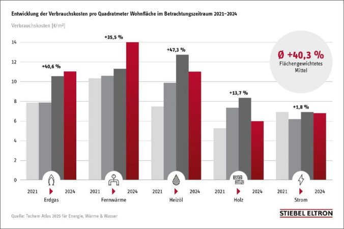 Die Verbrauchskosten für fossile Brennstoffe sind in den vergangenen Jahren dramatisch gestiegen, wie der „Techem Atlas 2025 für Energie, Wärme & Wasser“ berichtet: Pro Quadratmeter Wohnfläche verteuerte sich der Preis für Erdgas von 2021 bis 2024 um insgesamt 40,6 Prozent, bei Heizöl waren es 47,3 Prozent. Der für den Antrieb einer Wärmepumpe erforderliche Strom hat sich laut der Studie mit einem Anstieg von 1,8 Prozent nur moderat verteuert.