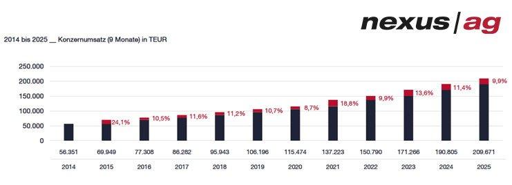 Zum 30.09.2025 standen liquide Mittel inkl. kurzfristiger Finanzdispositionen in Höhe von TEUR 126.674 (31.12.2024: TEUR 114.038). Die Nexus AG verfügt zum 30.09.2024 über ein Eigenkapital in Höhe von TEUR 304.858 (31.12.2024: TEUR 282.958). Die Eigenkapitalquote beläuft sich somit auf 62,3 % (31.12.2024: 64,6 %).
