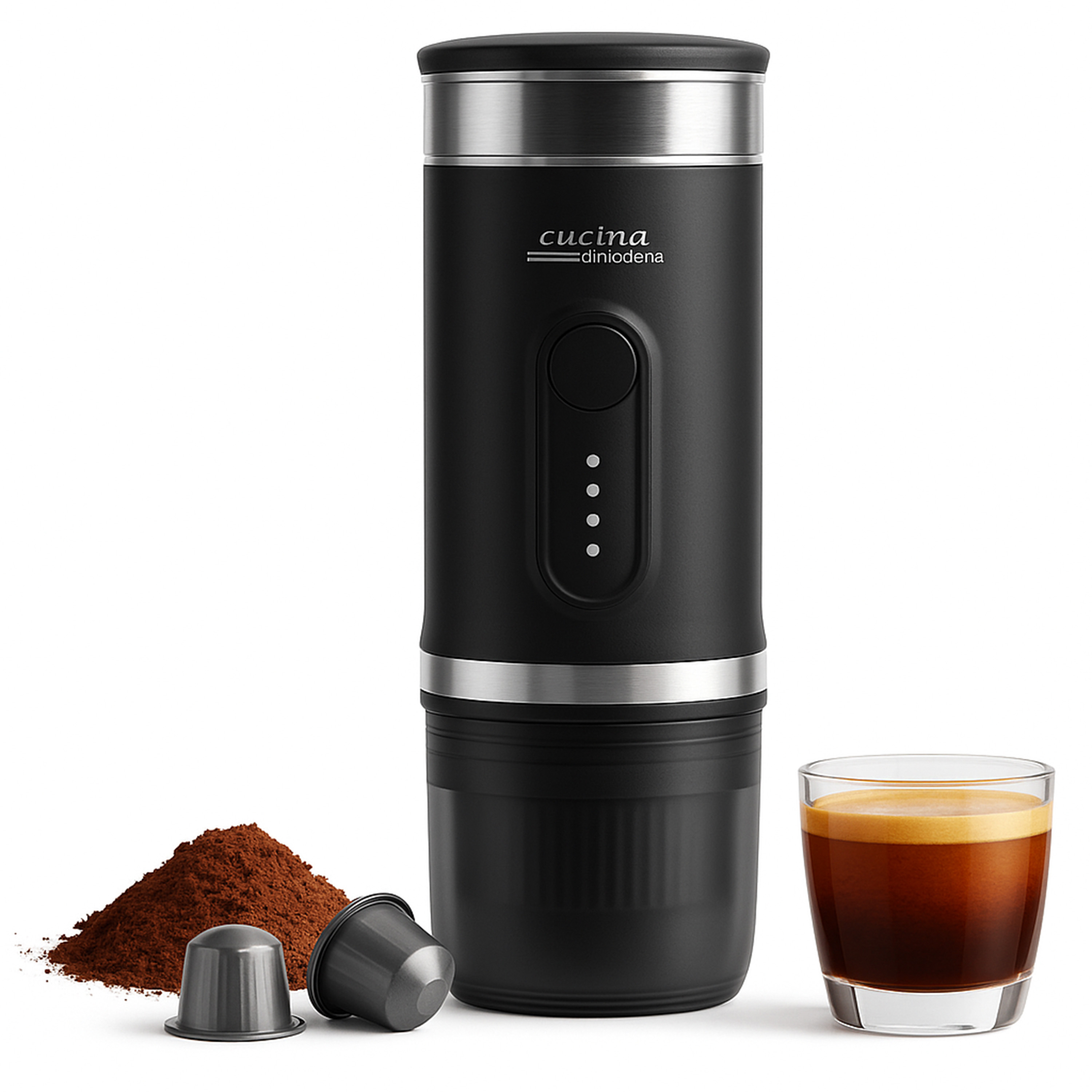Die Maschine arbeitet mit gemahlenem Kaffee oder mit Kapseln im Nespresso‑Format. So kann man wählen, ob man Kaffeepulver oder Kapseln verwendet. Die entsprechenden Einsätze sowie ein Kaffee-Messbecher und Trinkbecher sind im Lieferumfang enthalten. Perfekt für unterwegs, im Büro oder als zuverlässiger Begleiter auf Reisen.