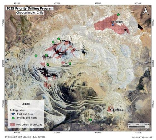 Norsemont Mining Inc. (CSE: NOM, OTC: NRRSF, FWB: LXZ1) („Norsemont“ oder das „Unternehmen“) freut sich bekannt zu geben, dass die erste Diamantbohrung des Phase-3-Explorationsbohrprogramms im unternehmenseigenen Projekt Choquelimpie in Nordchile, das eine stark sulfidische Gold-Silber-Kupfer-Lagerstätte beherbergt, abgeteuft wurde. Diese Bohrung ist auf die höhergradige Goldmineralisierung innerhalb der hydrothermalen Brekzienformation Vizcacha gerichtet (siehe nachstehende Abbildung). Das Phase-3-Programm umfasst ein Bohrvolumen von bis zu 5.000 Meter Diamantbohrungen („DDH“) und wird mit zwei (2) Diamantbohrgeräten durchgeführt. Die Bohrungen sollen bis Ende Dezember andauern.