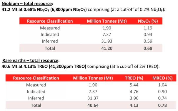 Am 1. April 2025 kündigte St George eine erste Ressource für das Projekt an, die sowohl eine weltweit bedeutende Niobium- als auch eine Seltene-Erden-Ressource darstellt, wie in Tabelle 3 unten gezeigt: