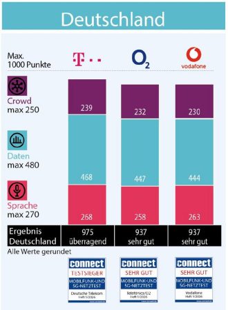 Hannes Rügheimer, connect-Autor, resümiert: “Wir gratulieren nicht nur den Testsiegern, sondern auch allen weiteren getesteten Anbietern. Sie konnten ihre Leistungen entweder steigern oder das Vorjahresergebnis halten – das ist angesichts herausfordernder Rahmenbedingungen und einem schon vorher recht hohen Niveau nicht selbstverständlich. Die Telekom bestätigt die „überragende“ Leistung aus dem Vorjahr und kann sich erneut um fünf Punkte verbessern. Bemerkenswert sind zudem die Steigerungen bei O2/Telefónica und auch Vodafone – sowie natürlich die Tatsache, dass diese beiden Anbieter sich den zweiten Platz teilen.“
