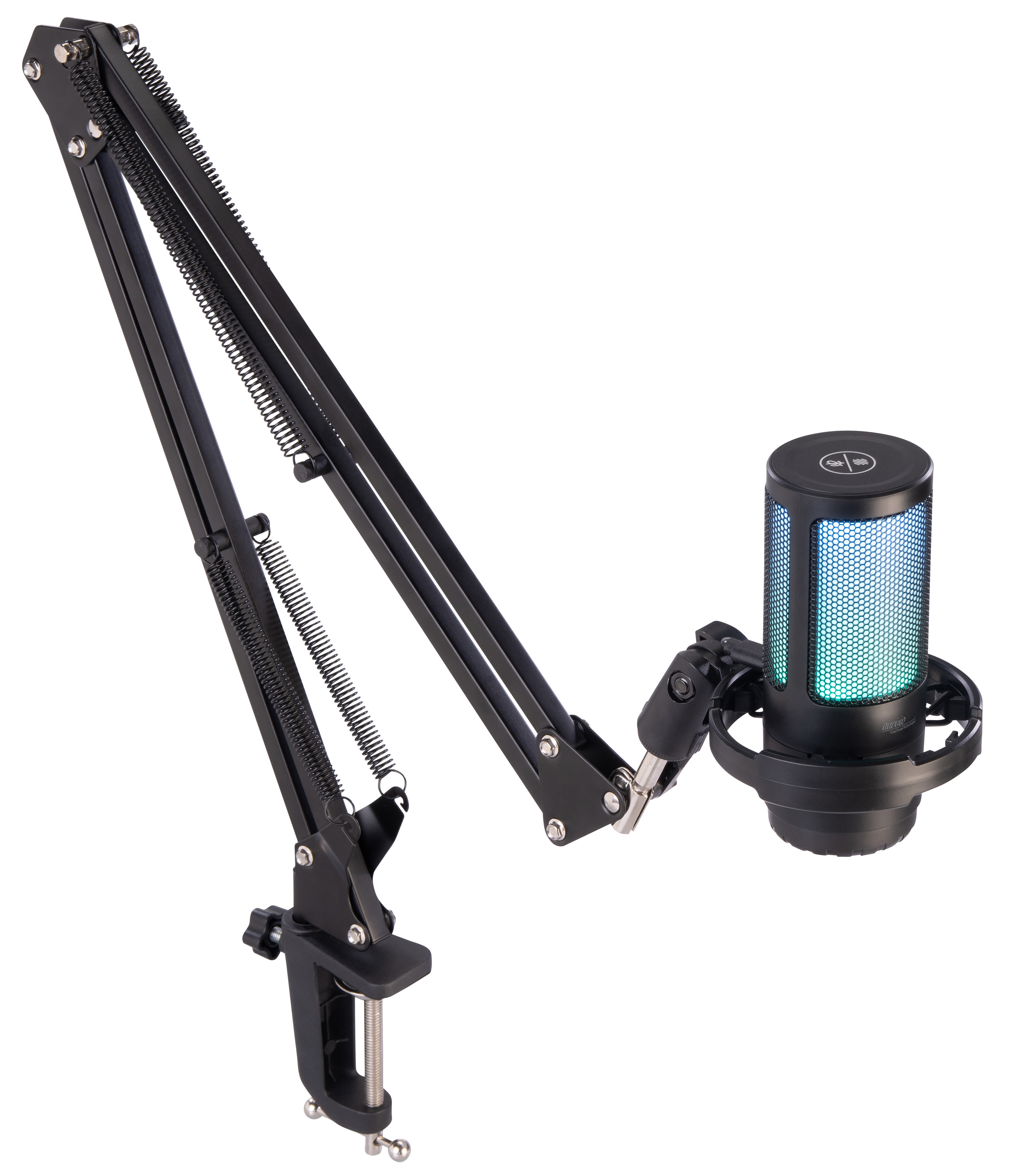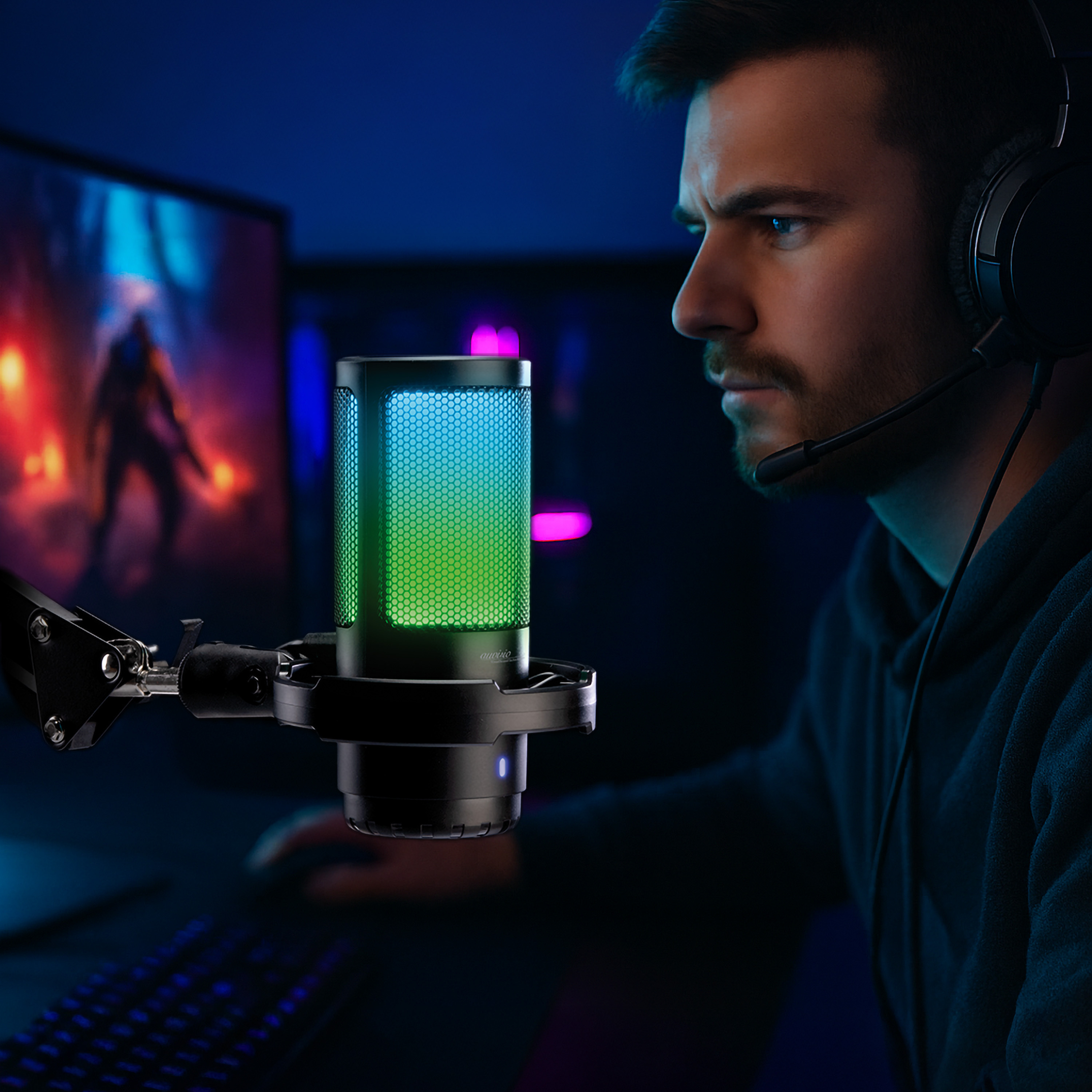 Stilvolles Design mit dynamischem RGB-Effekt: Der mehrfarbige RGB-Leuchtring setzt visuelle Akzente auf dem Schreibtisch. Die Beleuchtung reagiert auf den Klangverlauf und verleiht dem Setup eine individuelle Note – perfekt für Streams mit Wiedererkennungswert.