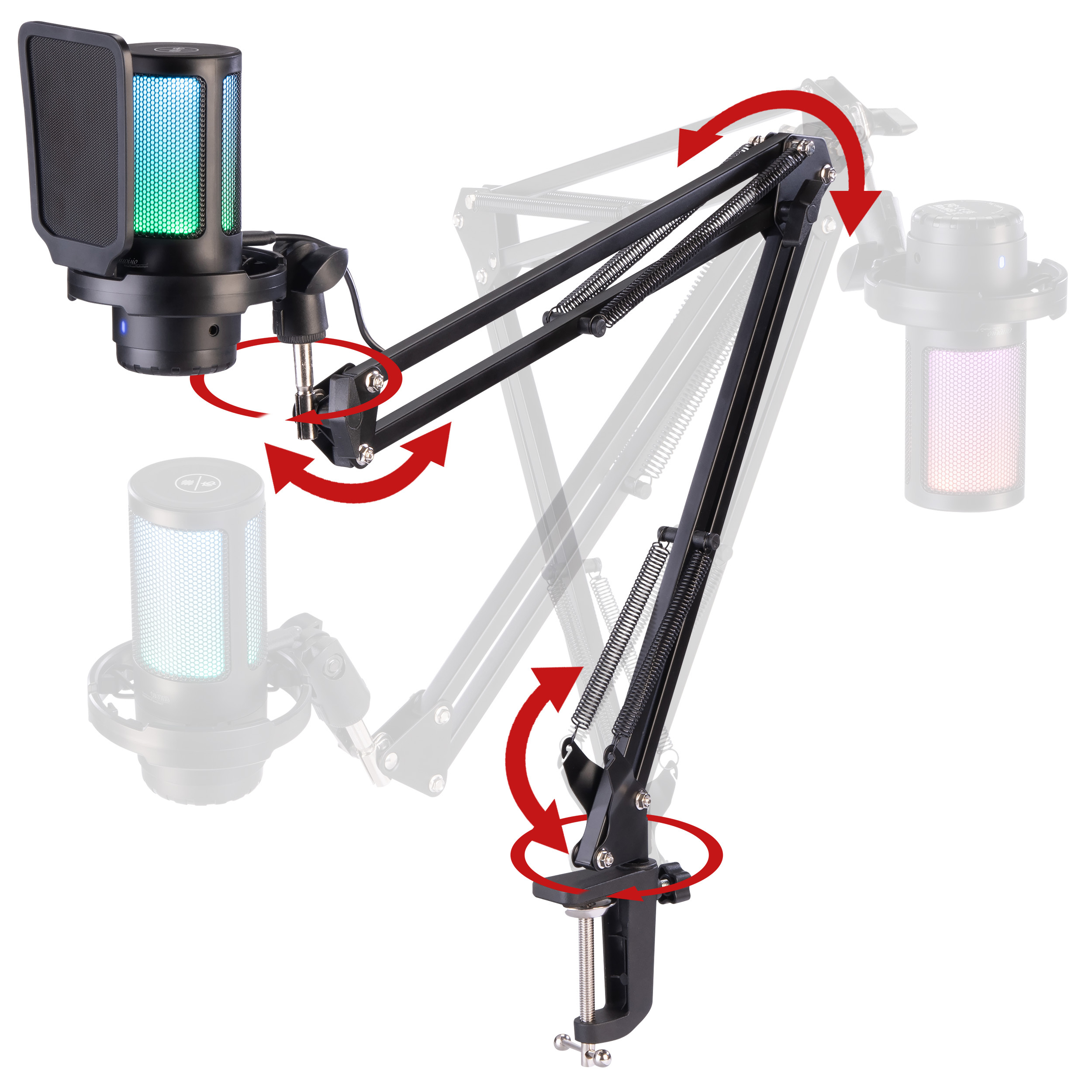 - Flexibler, gefederter 3-Achsen-Schwenkarm, ausziehbar bis 66 cm: für optimales Ausrichten des Mikrofons