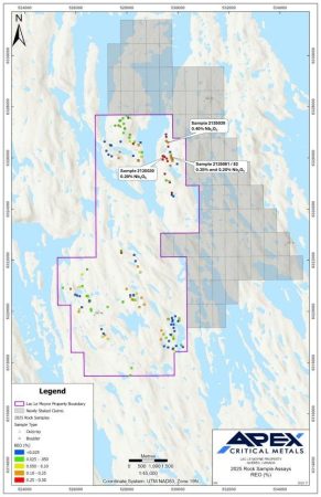Sean Charland, CEO von Apex Critical Metals, kommentierte: „Es gibt weltweit nur etwa 600 bekannte Karbonatitsysteme, daher bedeutet die Bestätigung eines Karbonatitvorkommens mit einer deutlich anomalen Niob- und Seltenerdoxid-Mineralisierung während unseres ersten Kartierungs- und Probenahmeprogramms auf Lac Le Moyne einen bedeutenden Fortschritt für das Projekt, der unsere Erwartungen noch übertrifft. Die Lage des Projekts nördlich des Eldor-Karbonatitkomplexes, der für seine hochgradige Seltenerd- und Flussspatlagerstätte Ashram sowie für hochgradiges Niob, Tantal und Phosphat bekannt ist, unterstreicht das Potenzial für weitere Entdeckungen in diesem Gebiet. Wir freuen uns darauf, die Folgearbeiten voranzutreiben, um die Ziele zu konkretisieren und auf den Ergebnissen dieses ersten Programms aufzubauen.“