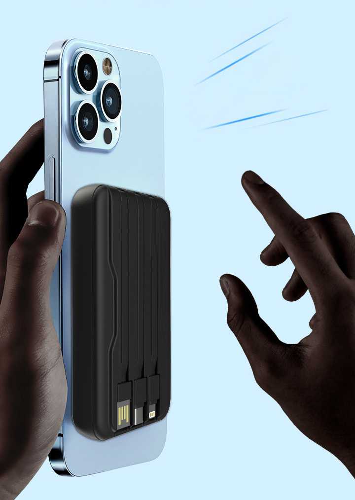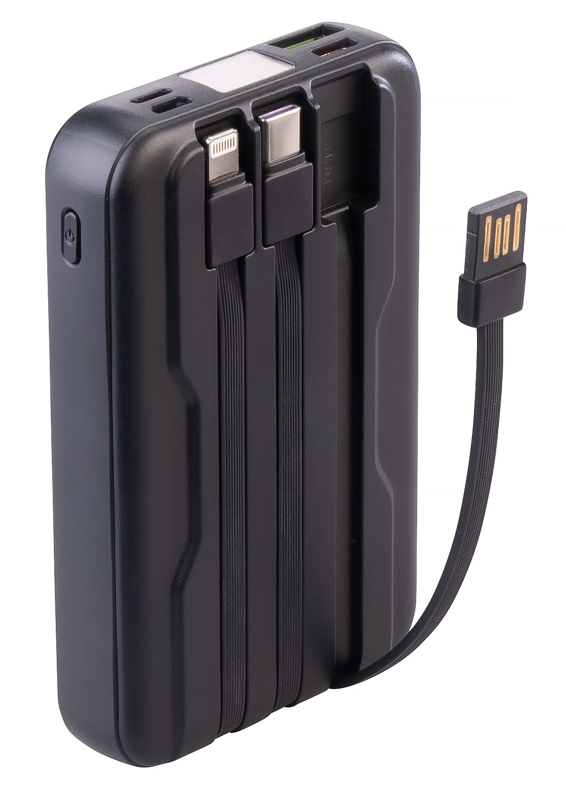 - 3 integrierte Ladekabel: USB-C-Stecker, 8-PIN-Stecker (Lightning-kompatibel) und USB-A-Stecker