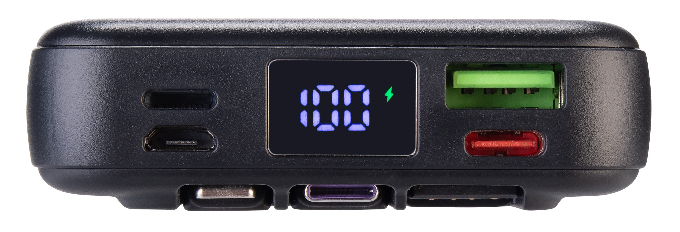 - Powerbank-Akku laden per USB-C mit Power Delivery: 5 V, 3 A / 15 W, 9 V, 2 A / 18 Watt, 12 V, 1,5 A / 18 Watt, per Micro-USB mit Quick Charge: 5 V, 2 A / 10 W, 9 V, 2 A / 18 Watt, 12 V, 1,5 A / 18 Watt, per 8-PIN-Anschluss: 5 V, 2 A / 10 Watt oder per USB-A: 5 V, 2 A / 10 Watt (kompatibles Netzteil bitte dazu bestellen)
