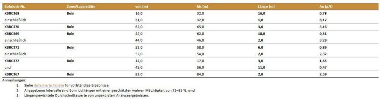 Die Bohrungen KBRC367 bis KBRC372 (6 RC-Bohrlöcher mit einer Gesamtlänge von 550 m) wurden im nordwestlichen Bereich der Goldlagerstätte Boin, und zwar in einer mineralisierten Struktur, die annähernd parallel zur Hauptzone der Lagerstätte verläuft, niedergebracht. Hier war das Ziel, die Lagerstätte durch die Erschließung einer oberflächennahen Mineralisierung zu erweitern. Die RC-Bohrungen bei Boin erfolgten in jeweils 50 Meter voneinander entfernten Abschnitten; die Bohrlöcher wurden entlang des jeweiligen Abschnitts in Abständen von 25 Metern abgeteuft. Die Bohrungen waren auf eine oberflächennahe Mineralisierung gerichtet; die einzelnen Bohrlöcher erreichten eine senkrechte Tiefe von maximal 70 Metern. Die in dieser Pressemitteilung erwähnten Bohrlöcher verteilen sich auf vier voneinander unabhängige Abschnitte, die sich über eine Streichlänge von 400 Meter erstrecken.
