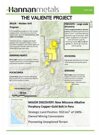 Im Laufe des Jahres 2021 hat Hannan 910 km2 an zu 100 % unternehmenseigenen Bergbaukonzessionen in Valiente abgesteckt und hält diese weiterhin. Diese umfassen unerforschtes Gelände mit potenziellen mineralisierten Porphyr-Zielen im zentralen Osten Perus. Das Projekt Valiente hat sich rasch von einem Greenfield-Prospektionsprojekt zu einer Multi-Prospektionsmöglichkeit entwickelt.
