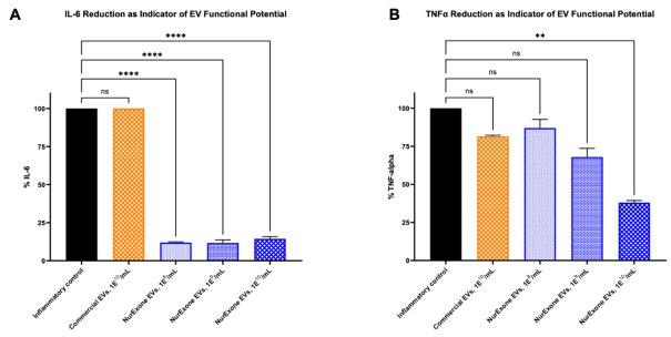 (A) NurExone-BM-MSC-EVs reduzierten die IL-6-Spiegel bei allen getesteten Konzentrationen robust um mehr als 86 %, während kommerzielle BM-MSC-EVs zu keiner Abnahme von IL-6 führten.