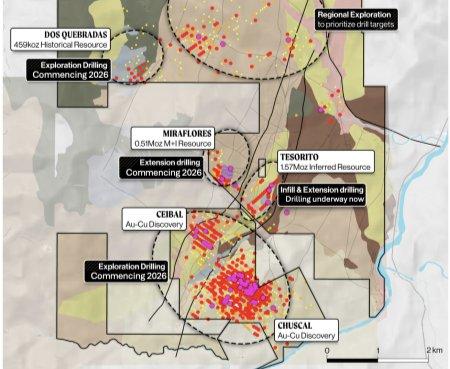 Quinchía liegt in einem zunehmend nachgewiesenen Goldrevier und nach Ansicht des Unternehmens ist das breitere System über die Grenzen der aktuellen Ressourcengebiete hinaus immer noch unzureichend erkundet. Die Bohrungen und Feldarbeiten im Laufe von 2026 werden sich auf die Erweiterung der Ausmaße der Mineralisierung und die Ermittlung der nächsten Gruppe an vorrangigen, für Bohrungen aufgeschlossenen Zielen konzentrieren.