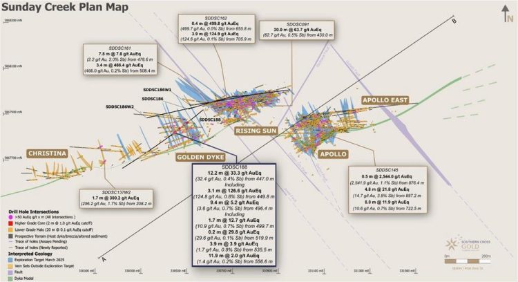 Southern Cross Gold Consolidated Ltd („SXGC“, „SX2“ oder das „Unternehmen“) (TSX:SXGC) (ASX:SX2) (OTCQX:SXGCF) (Frankfurt: MV3.F) (- https://www.commodity-tv.com/play/southern-cross-gold-200000m-drill-program-to-significantly-increase-the-resource-target/ -) gibt die Ergebnisse von vier Bohrlöchern aus dem zu 100 % unternehmenseigenen Sunday Creek Gold-Antimon-Projekt in Victoria bekannt (Abbildungen 1 bis 5). Zu den besten Ergebnissen zählen 12,2 m mit 32,4 g/t Au ab 447,0 m im Bohrloch SDDSC188, einschließlich des bislang höchsten Einzel-Au-Gehalts (0,2 m mit 1.050 g/t Au) in Golden Dyke.
