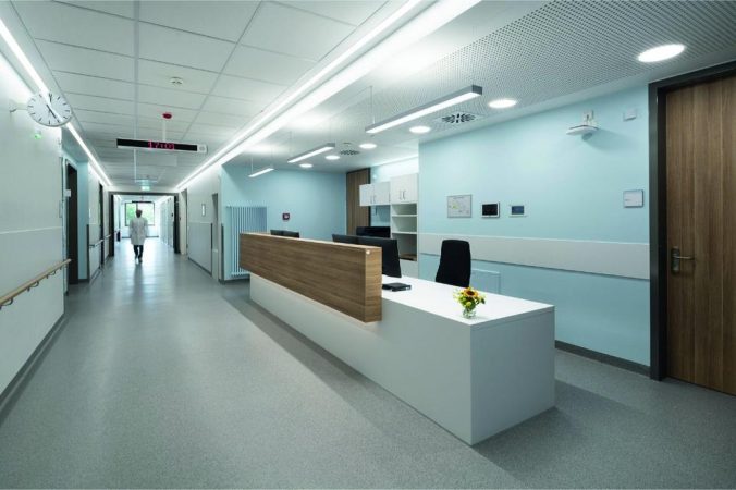 Ein herausragendes Beispiel für die partnerschaftliche Zusammenarbeit ist der Neubau des Haus Kußmaul am Universitätsklinikum Freiburg. Der modulare Neubau wurde von KLEUSBERG in Rekordzeit errichtet und von H2S Architekten BDA geplant. Die Räume sind mit langlebigen Tarkett iQ Bodenbelägen ausgestattet, die höchste Anforderungen an Hygiene, Strapazierfähigkeit und Pflegeleichtigkeit erfüllen – besonders wichtig für sensible klinische Bereiche.