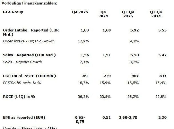 Die vorläufige EBITDA-Marge vor Restrukturierungsaufwand beläuft sich im Gesamtjahr 2025 auf 16,5 Prozent. Diese liegt somit leicht oberhalb des bisher prognostizierten Korridors von 16,2 bis 16,4 Prozent. Des Weiteren beträgt der vorläufige Auftragseingang im vierten Quartal 1.828 Mio. Euro und liegt damit um 7,0 Prozent über der durchschnittlichen Markterwartung* in Höhe von 1.708 Mio. Euro. Das vorläufige organische Wachstum des Auftragseingangs für das Gesamtjahr 2025 beträgt damit 9,1 (Vorjahr: 4,6 Prozent). Basierend auf vorläufigen Zahlen und einer prognostizierten Steuerquote von etwa 28 Prozent erwartet GEA im Geschäftsjahr 2025 für das berichtete Ergebnis je Aktie einen Wert zwischen 2,60 und 2,70 Euro (Vorjahr: 2,30 Euro).