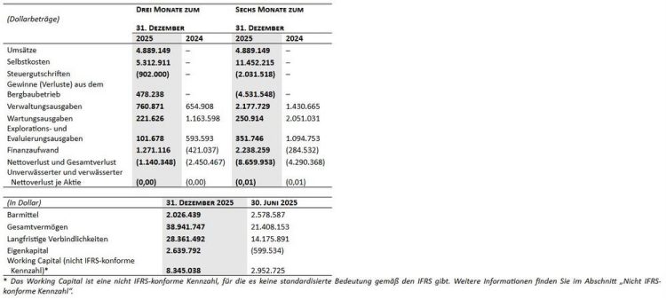 – Am 22. Dezember 2025 schloss das Unternehmen mit der Firma Glencore AG eine Zusammenfassung der verbindlichen Bedingungen für eine vorrangige Fremdfinanzierung mit einem Kapitalbetrag von bis zu 30 Mio. $ sowie eine Produktionskaufvereinbarung. Die finalen Vereinbarungen wurden am 30. Januar 2026 abgeschlossen.