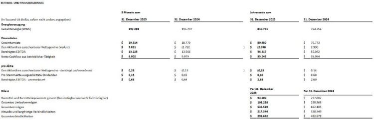 – Im Quartal zum 31. Dezember 2025 stieg die konsolidierte Energieproduktion im Vergleich zum Vorjahresquartal um 1 %, während die konsolidierte Jahresenergieproduktion für das zum 31. Dezember 2025 endende Geschäftsjahr 810.731 MWh betrug, gegenüber 764.756 MWh für das zum 31. Dezember 2024 endende Geschäftsjahr.