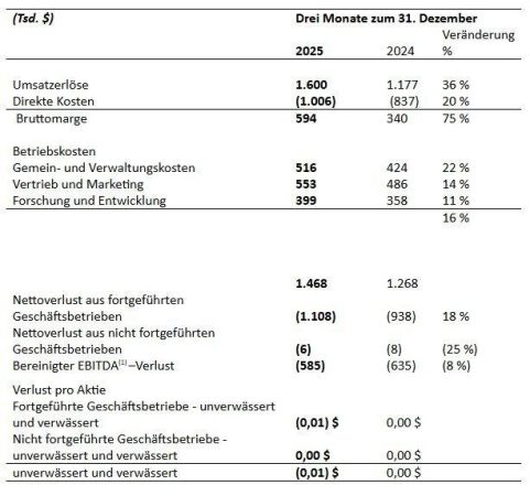 –          Für das erste Quartal 2026 wurde ein bereinigter EBITDA(1)-Verlust in Höhe von 585 $ ausgewiesen, was einer Verbesserung um 50 $ gegenüber dem Vergleichszeitraum des Vorjahres entspricht.
