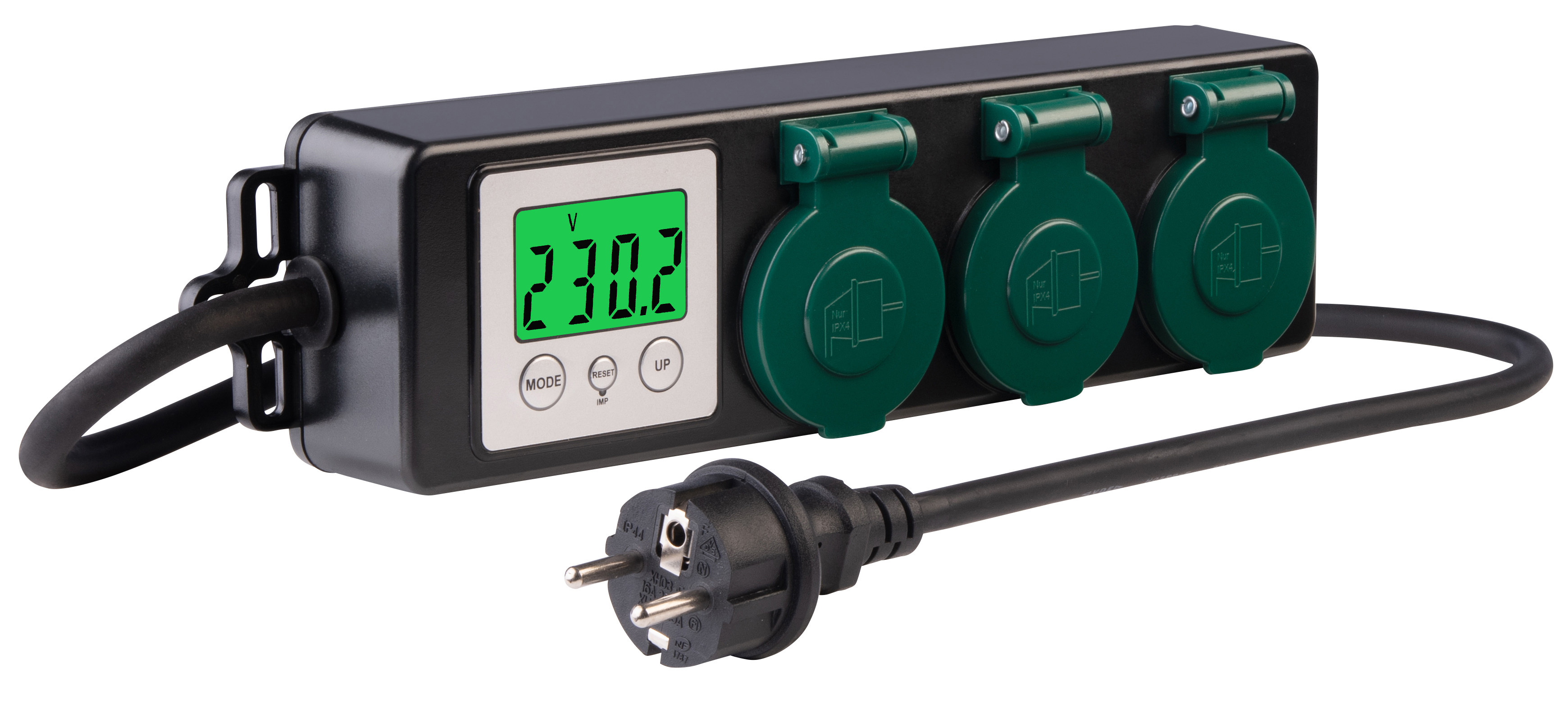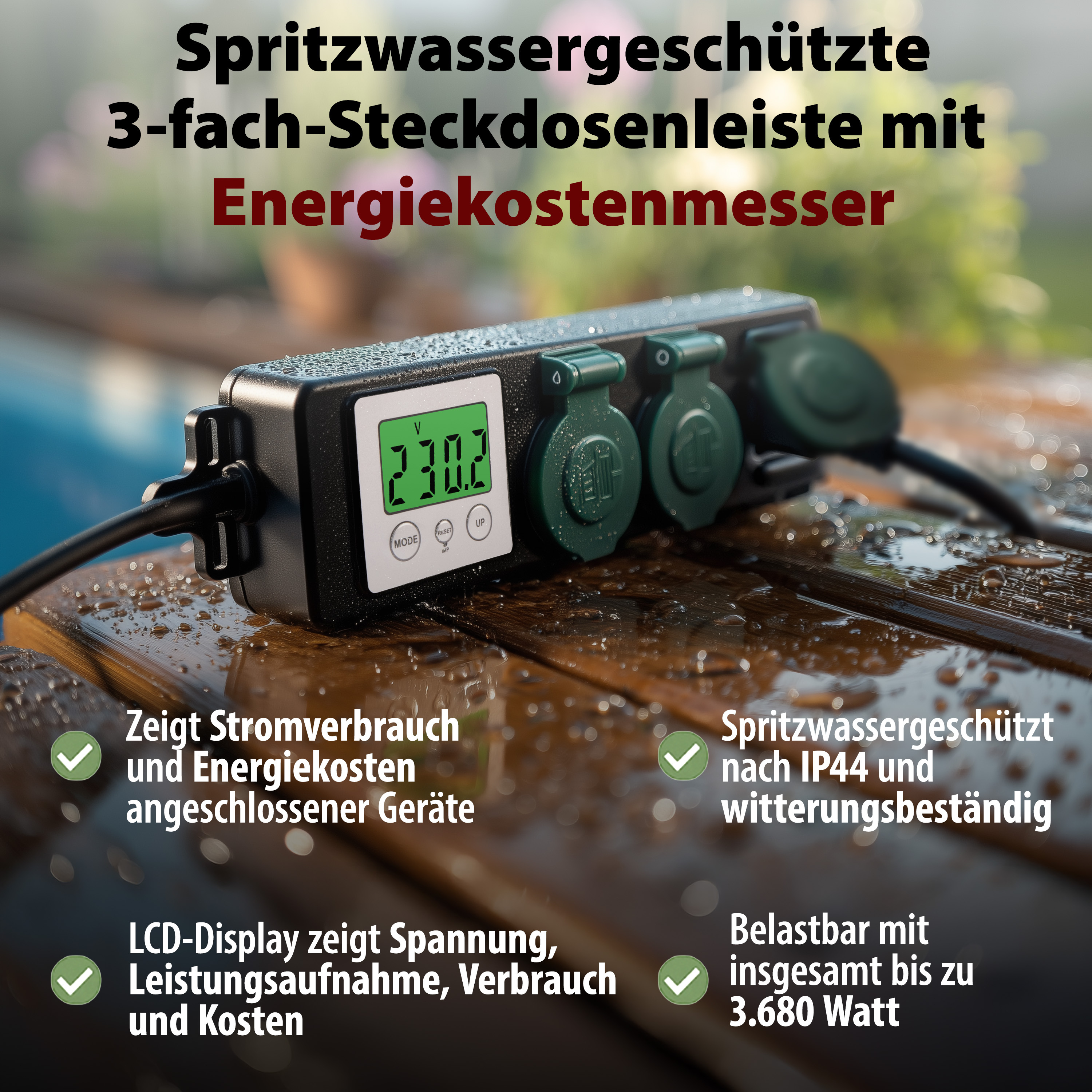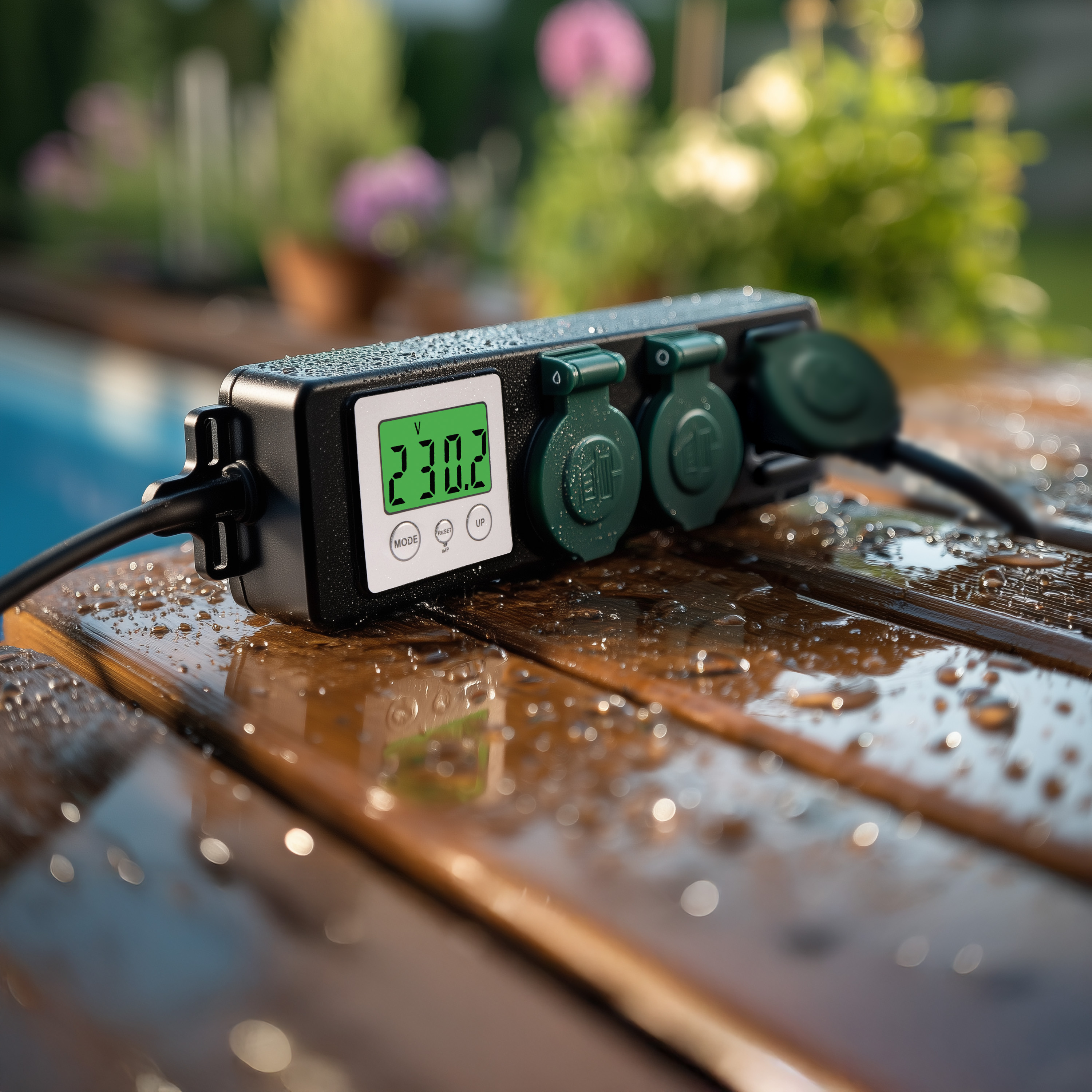 Ein integriertes LCD-Display erfasst präzise, wie viel Leistung angeschlossene Geräte verbrauchen und welche Kosten dabei entstehen. Das schafft Transparenz beim Stromverbrauch – ob Elektrogrill, Rasenmäher oder Gartenbeleuchtung.