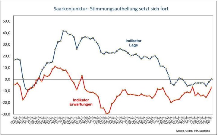 „Die Saarwirtschaft ist seit Jahresbeginn erfreulich in die Aufwärtsbewegung gekommen – aber dieser Aufschwung steht auf dünnem Eis. Denn an den strukturellen Rahmenbedingungen hat sich bislang wenig geändert: Hohe Kosten, Abgaben und anhaltende politische Unsicherheit bremsen Investitionen und Konsum weiter aus. Gleichzeitig wächst der Druck von außen. Der Nachfragerückgang in China und die aggressive Exportstrategie chinesischer Anbieter verschärfen den Wettbewerb spürbar. Und die latente Gefahr neuer Handelskonflikte und zusätzlicher Zölle bleibt real. In einer Phase geschwächter Wettbewerbsfähigkeit trifft dieser China- und Zollschock – verstärkt durch die Dollarschwäche – eine exportorientierte Industrieregion wie das Saarland besonders hart. Kurzum: Wir haben bessere Stimmung, aber noch keine stabile Basis. Wenn aus der aktuellen Aufhellung eine tragfähige Erholung werden soll, braucht es jetzt eine klare wirtschaftspolitische Kurskorrektur. Die Bundesregierung muss ein glaubwürdiges Aufbruchssignal senden und eine Reformagenda liefern, die Wirkung entfaltet. Investitionen, Innovationen, Gründungen und unternehmerische Tätigkeit müssen wieder einfacher, attraktiver und lohnender werden. Nur dann stärken wir die Wettbewerbsfähigkeit des Standorts dauerhaft und bringen die Wirtschaft zurück auf einen Wachstumspfad, der den Namen verdient.“ So kommentierte IHK-Hauptgeschäftsführer Dr. Frank Thomé die Ergebnisse der Februar-Umfrage der IHK Saarland, an der sich rund 300 Unternehmen mit gut 90.000 Beschäftigten beteiligten.