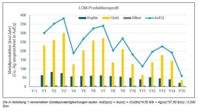 - Die durchschnittliche jährliche Produktion wird für die ersten drei Betriebsjahre auf 345.000 Unzen Goldäquivalent („AuEq“) geschätzt, die Gesamtproduktion über die gesamte Lebensdauer der Mine („LOM“) auf 3,6 Mio. Unzen AuEq, bestehend aus 2,6 Mio. Unzen Gold, 6,9 Mio. Unzen Silber und 592 Mio. Pfund Kupfer, bei einer Lebensdauer der Mine von 14,6 Jahren.
