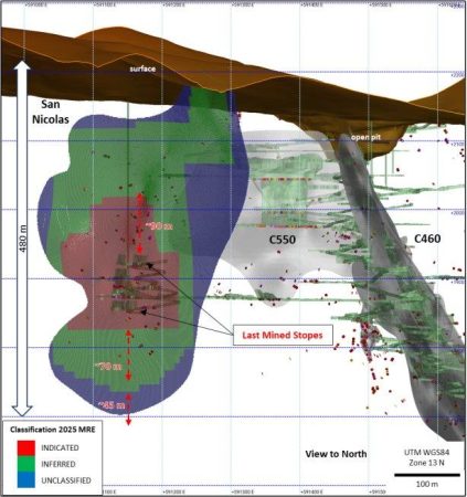 –          Bohrloch IDP-SN-26-001 bestätigte zusammen mit den zuvor niedergebrachten Bohrlöchern das Vorkommen eines hochgradigen Mineralisierungsblocks, der sich entlang einer Mindeststreichlänge von 45 m mindestens 90 m über die zuletzt bei San Nicolas abgebauten Strossen nach oben hinaus erstreckt.